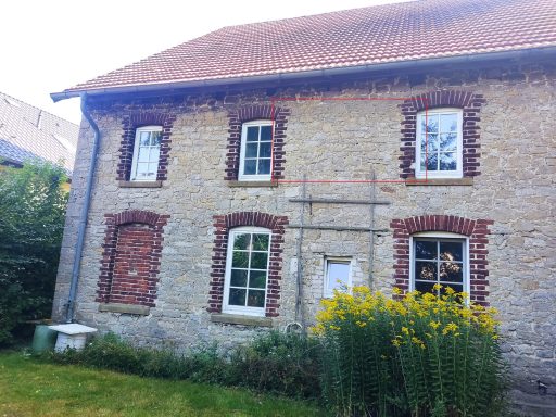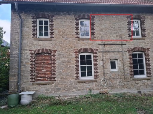 Die Erklärung der Situation im Kontext der Restaurierung bezieht sich auf die offenen Fugen an der Wetterseite, die zu Zugluft durch das Bruchsteinmauerwerk führten. Um den ursprünglichen Charakter des Bruchsteinhauses von 1889 zu bewahren, wurden lediglich schadhafte und fehlende Fugen mit passendem Material erneuert. Diese behutsame Vorgehensweise stellt sicher, dass die historische Integrität des Gebäudes erhalten bleibt, während gleichzeitig die Funktionalität verbessert wird.